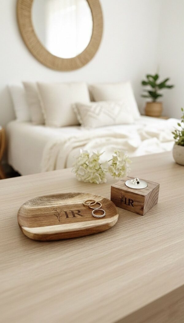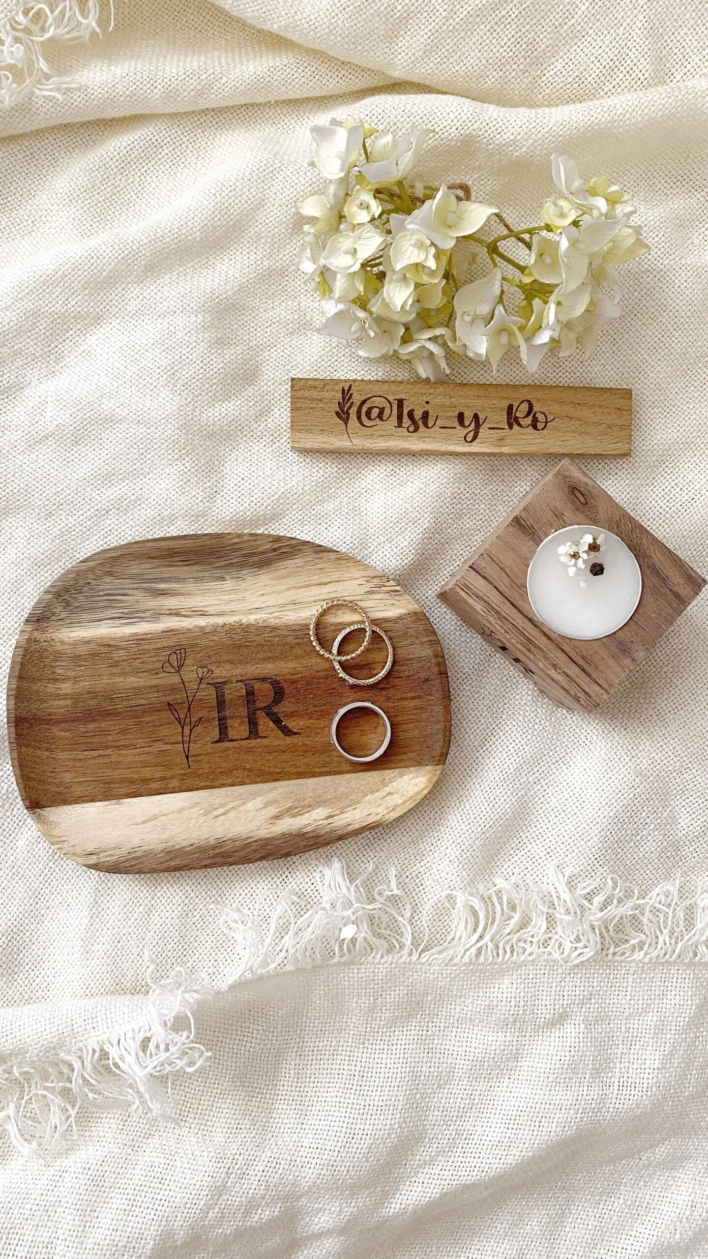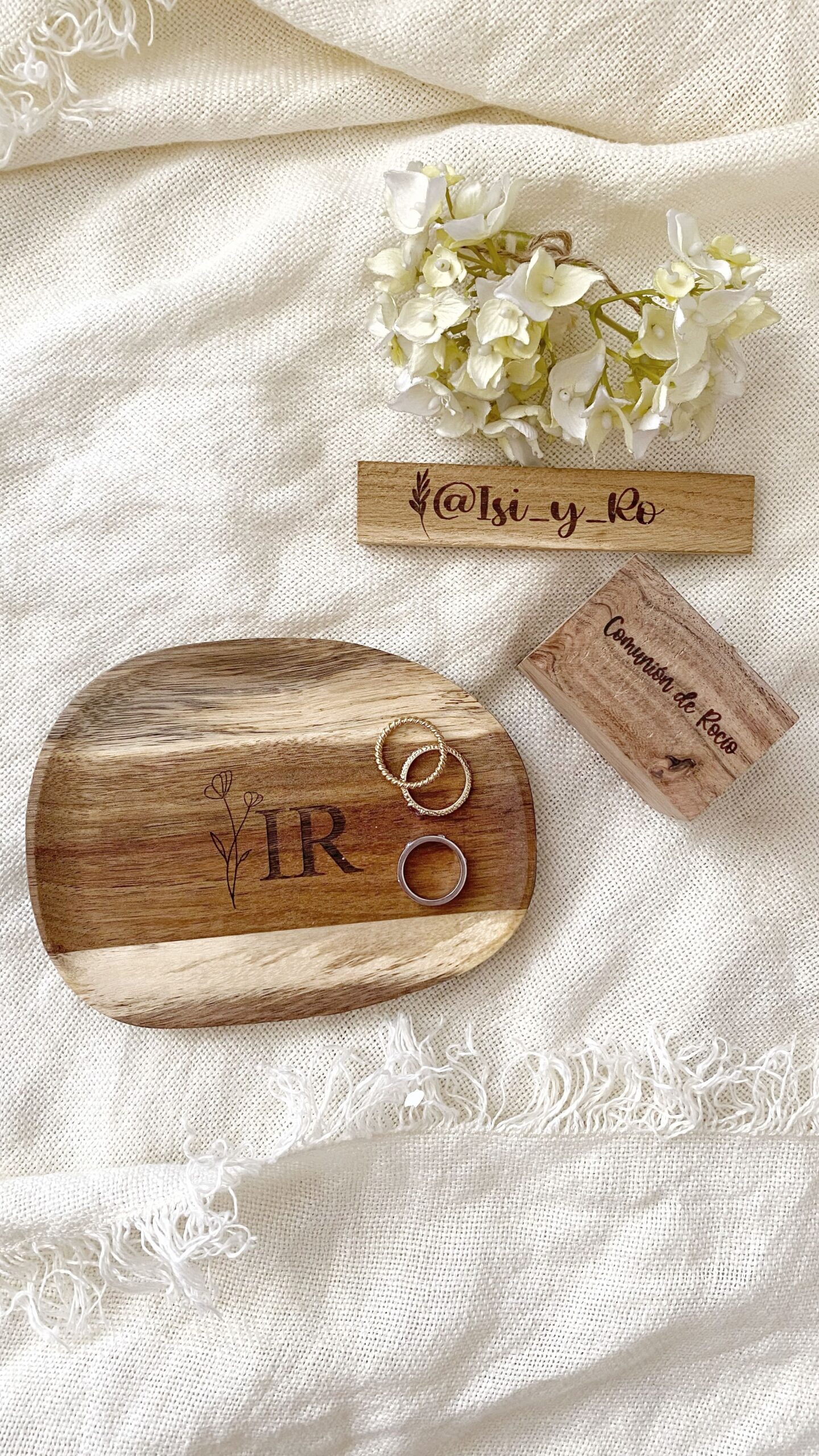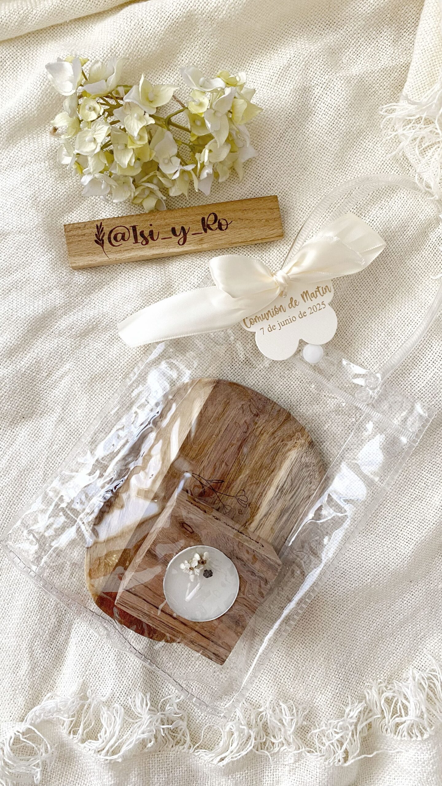 Este set de madera de acacia auténtica combina la funcionalidad de una bandeja vacia bolsillos (ideal para joyas o llaves) con la calidez de un porta velas artesanal. El veteado natural de la acacia hace que cada pieza sea única, igual que vuestro evento.