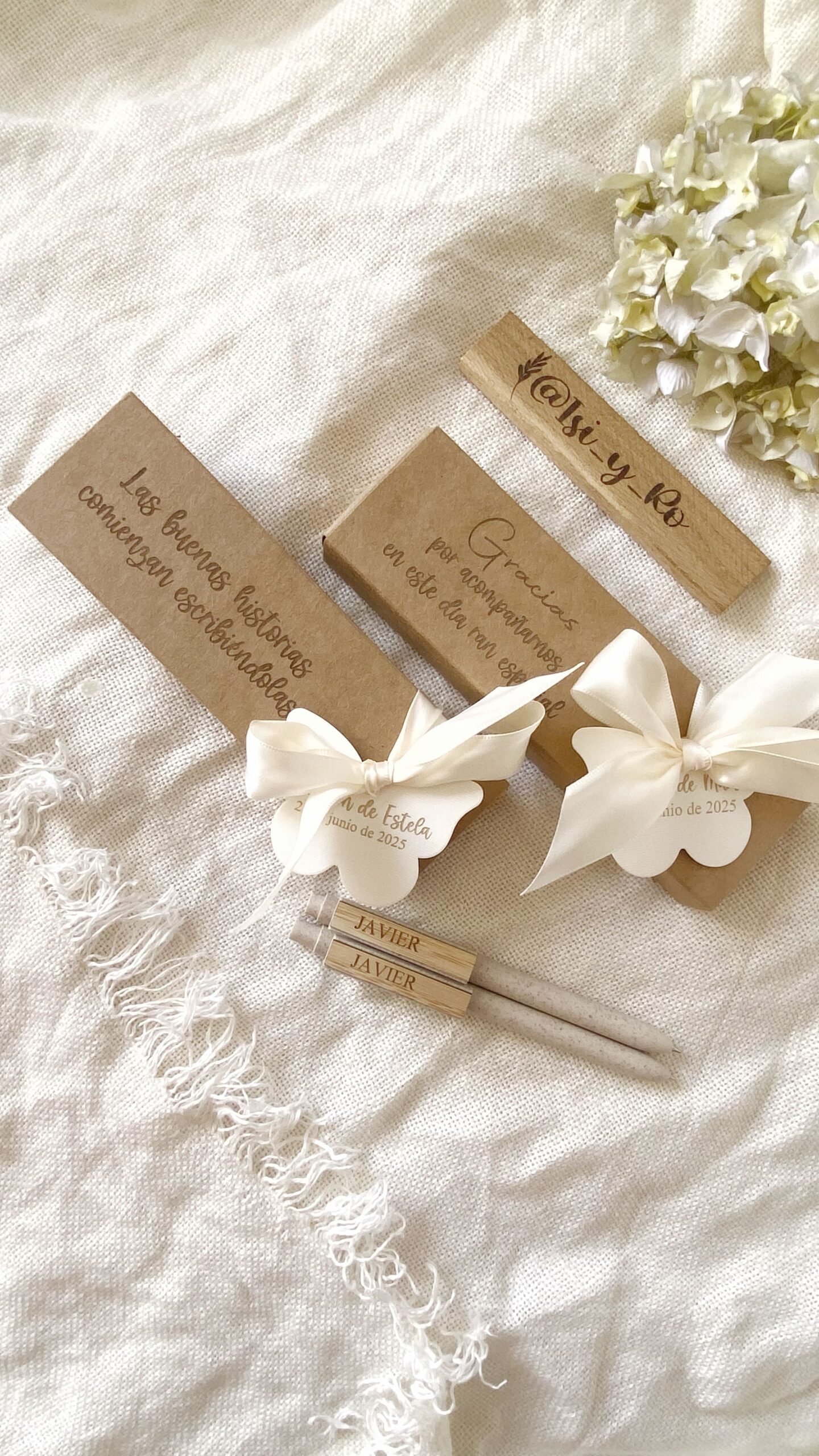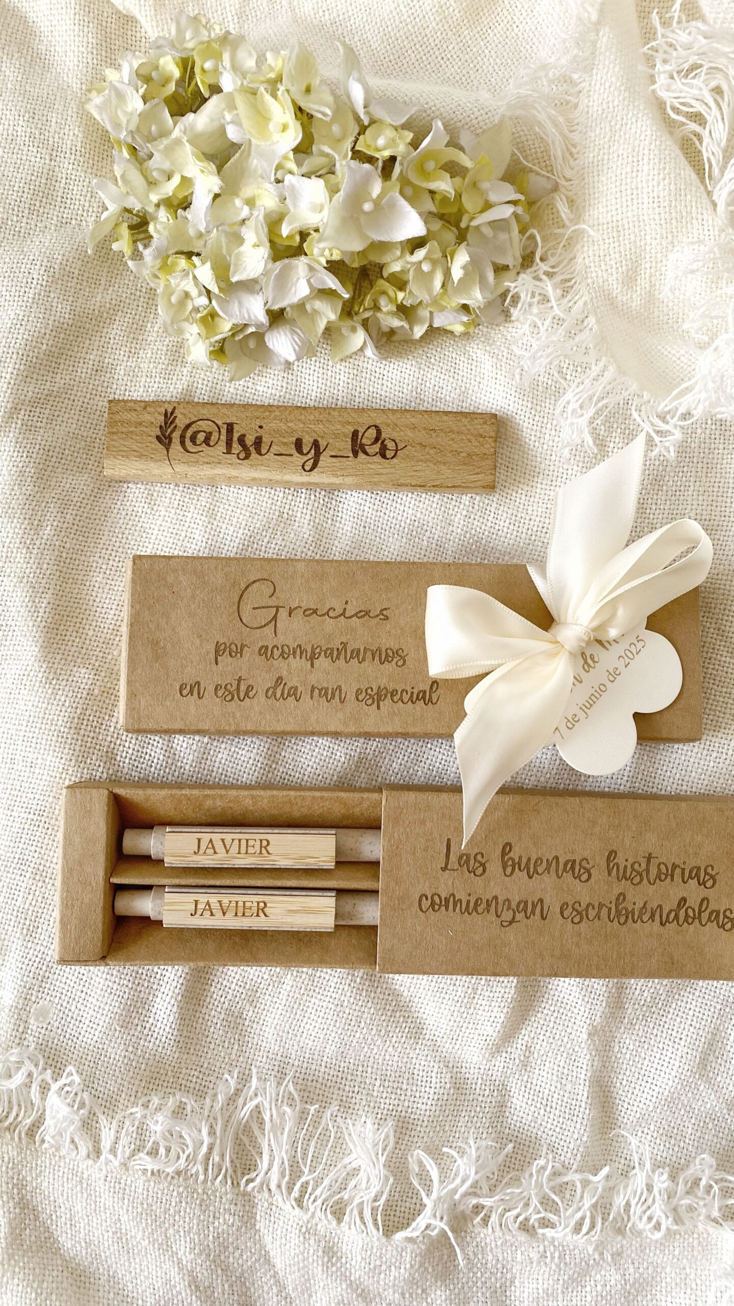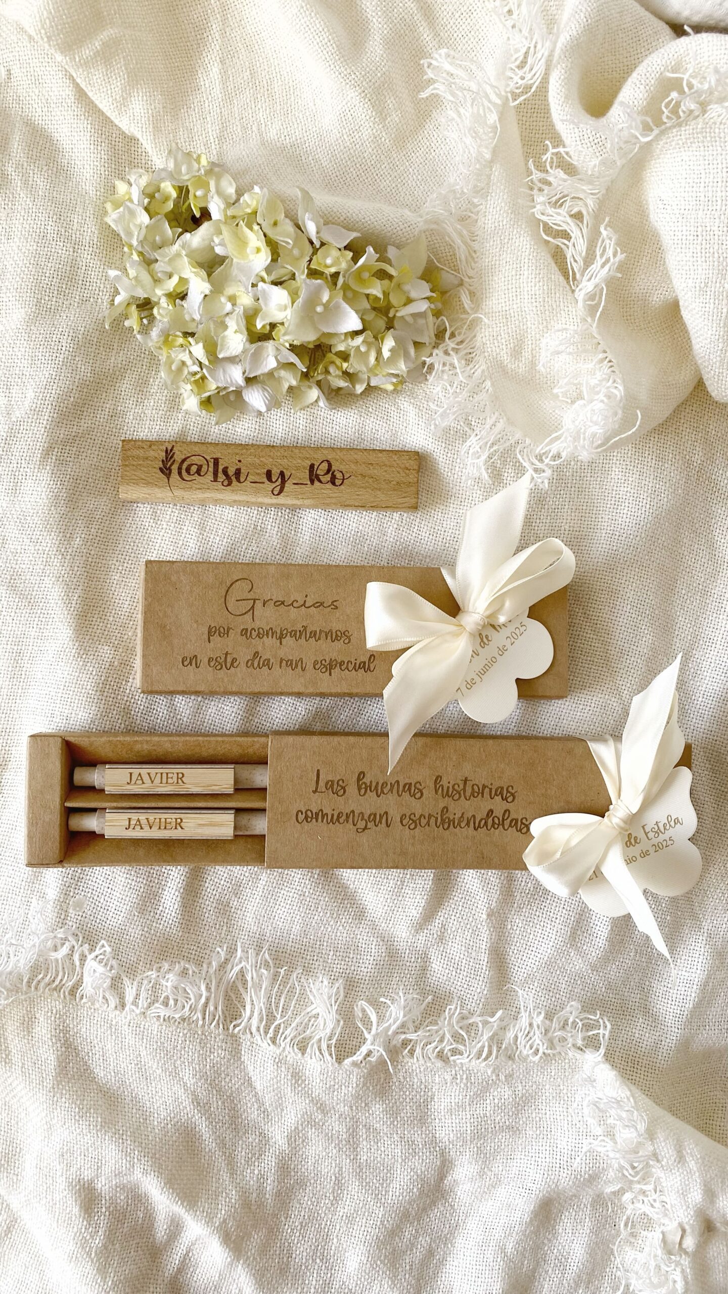 Este bonito detalle de set de bolígrafo y portaminas personalizado es mucho más que un útil de escritura. Es un pedacito de ese día especial que tus seres queridos se llevarán a casa. Con un diseño de inspiración orgánica y acabado moteado, este conjunto une la elegancia de lo natural con la calidez de lo artesanal.