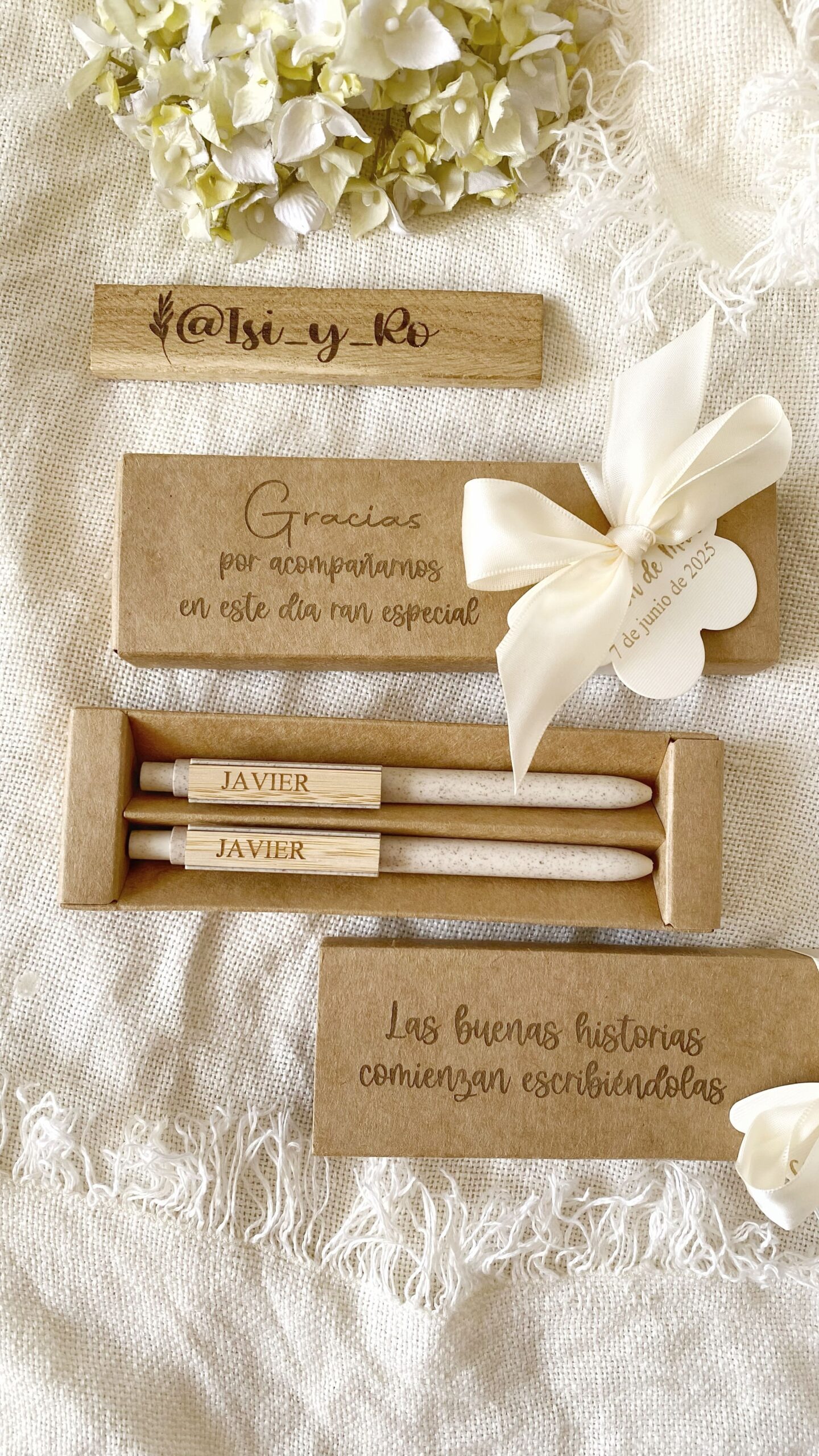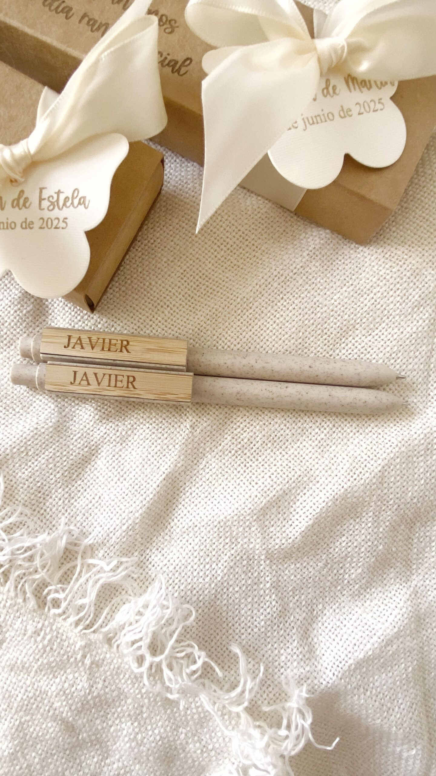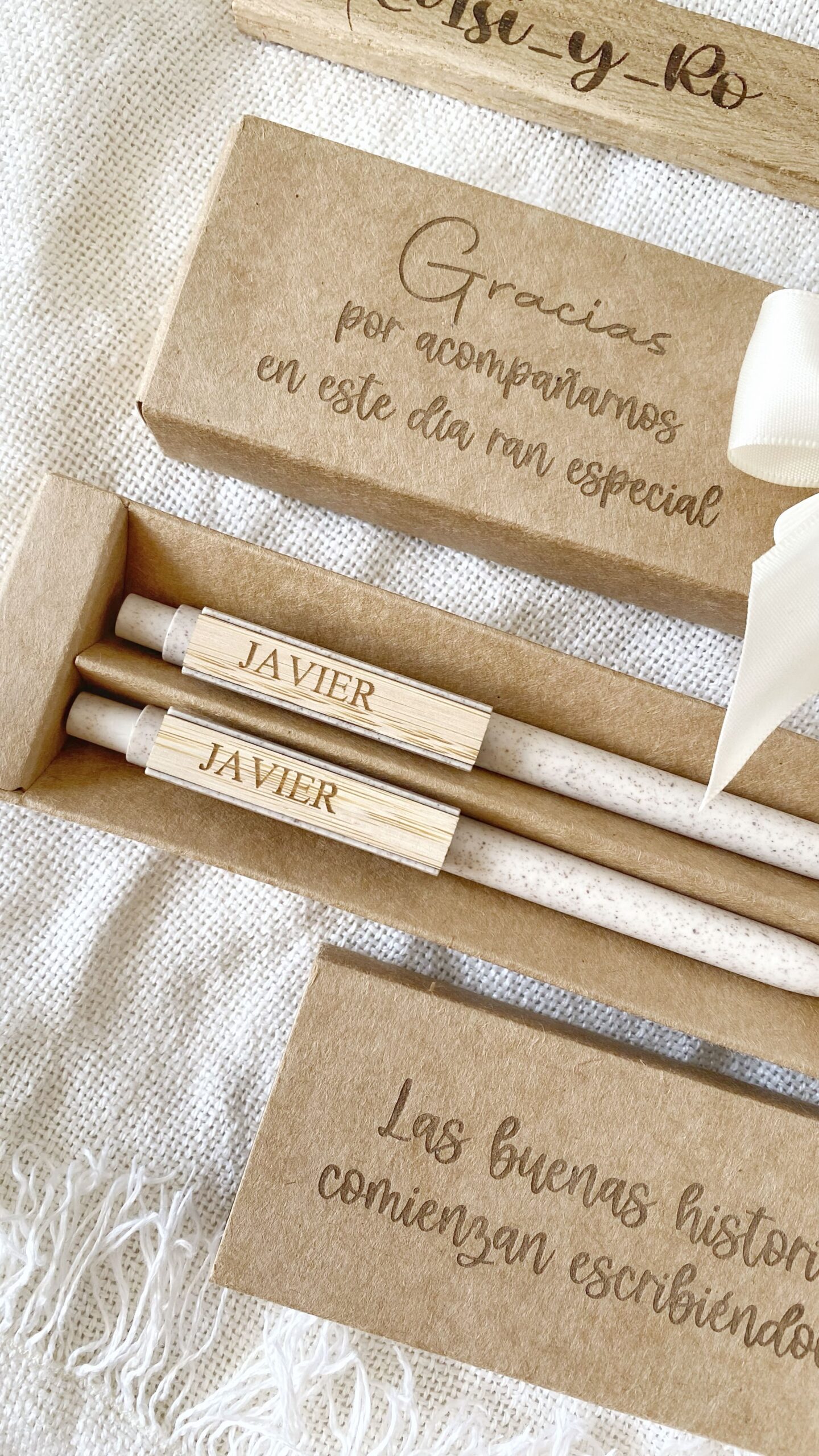 Este bonito detalle de set de bolígrafo y portaminas personalizado es mucho más que un útil de escritura. Es un pedacito de ese día especial que tus seres queridos se llevarán a casa. Con un diseño de inspiración orgánica y acabado moteado, este conjunto une la elegancia de lo natural con la calidez de lo artesanal.