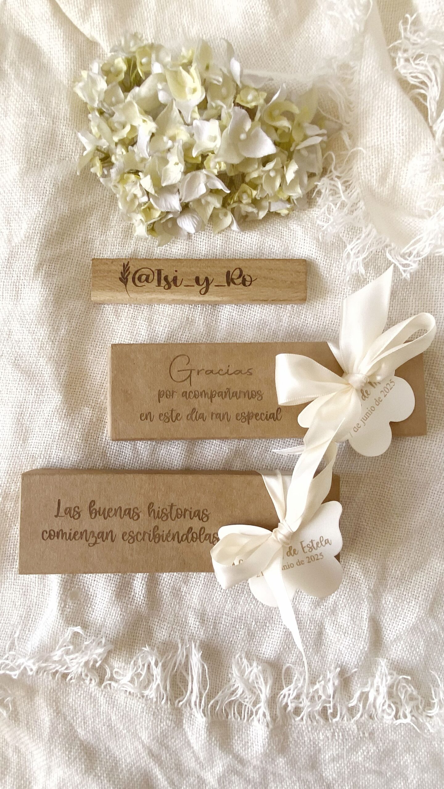 Personalización única: Grabamos con mimo el nombre de esa persona especial, de los anfitriones o una fecha inolvidable. El grabado a láser sobre el clip de madera garantiza que el recuerdo no se borre con el tiempo.