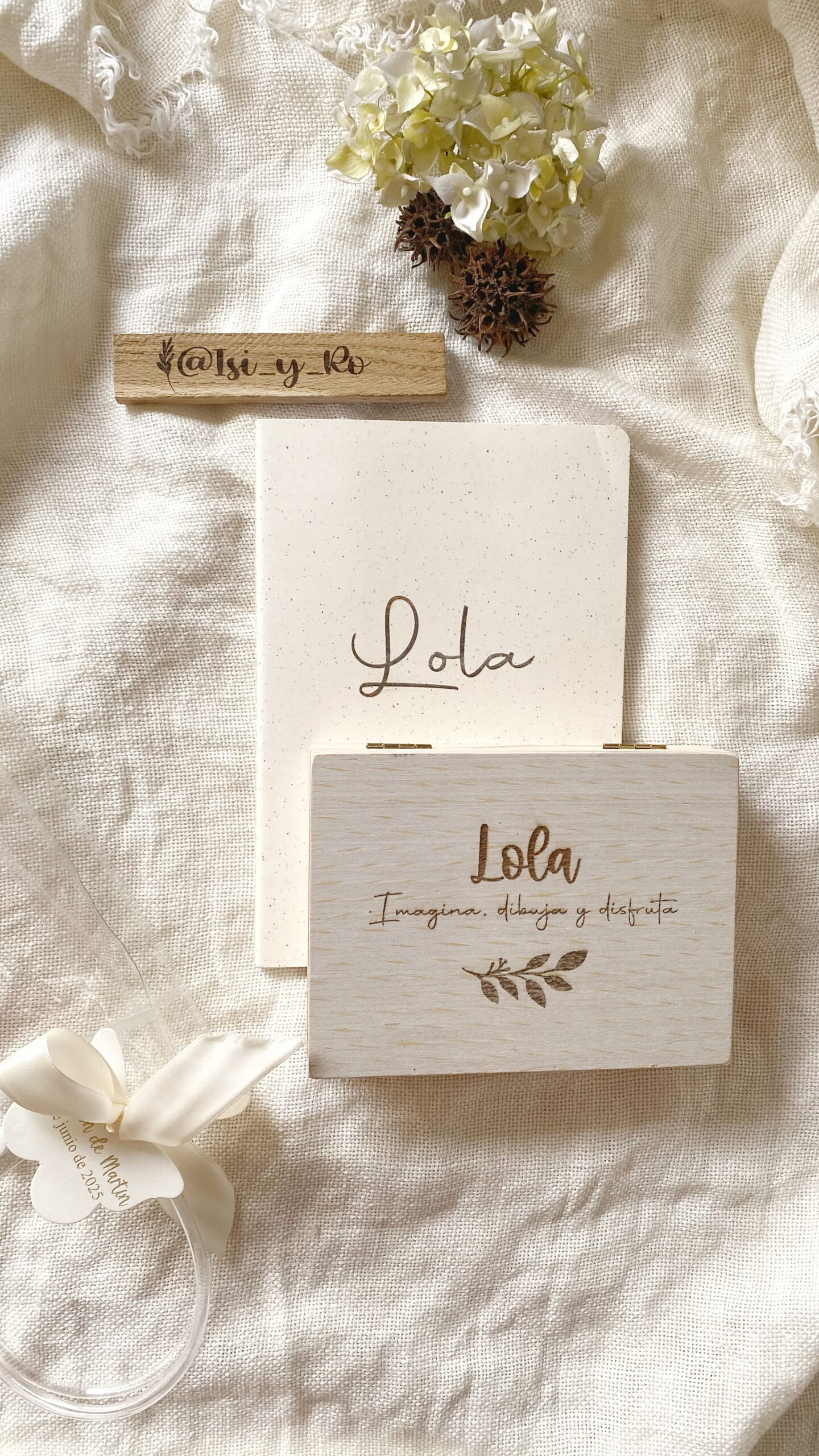 Estuche de madera grabado: Con el nombre del peque (o la frase que elijas) grabado a láser sobre madera natural. Un maletín que guardarán durante años.