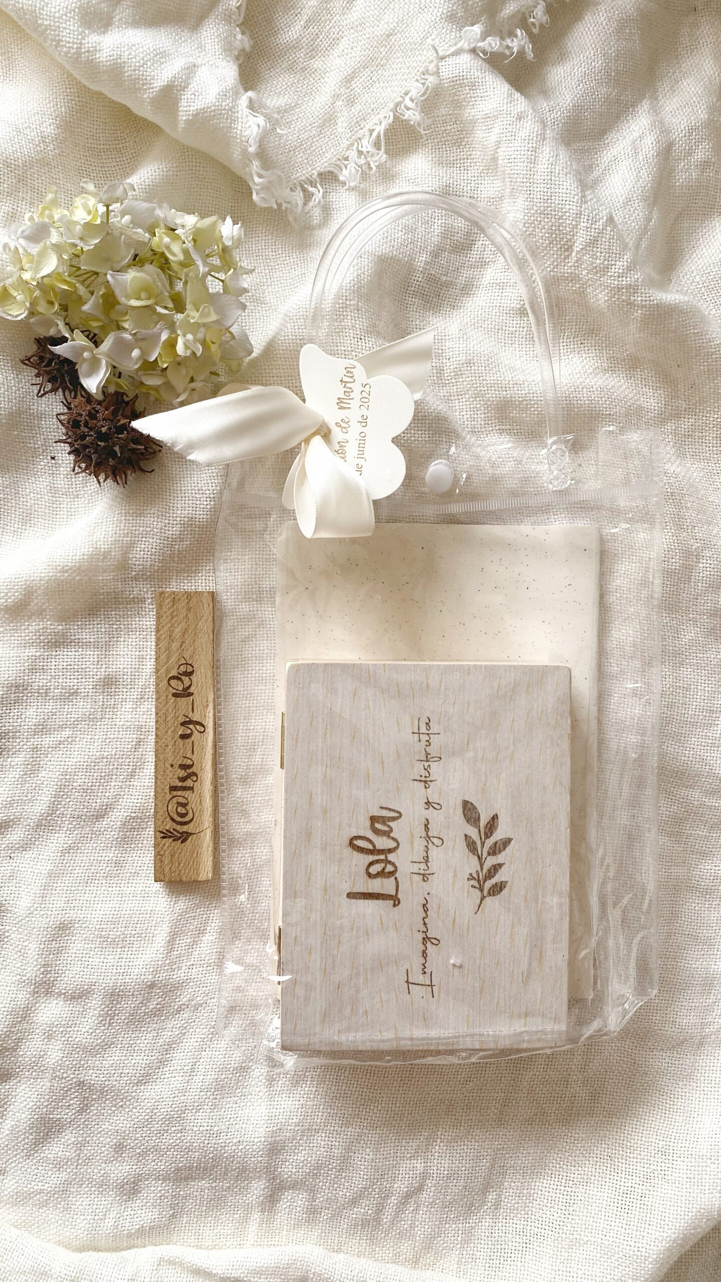 Presentación Isi y Ro: Como siempre, cuidamos el packaging al máximo con nuestra bolsa transparente premium, lazo de raso y etiqueta personalizada del evento, porque recibir un regalo también es un arte.