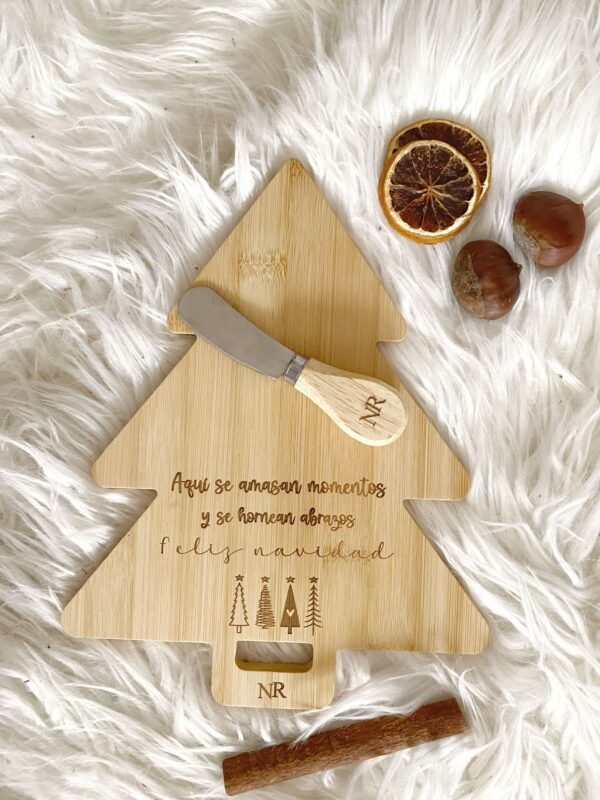 - Tanto la tabla como el cubierto viene personalizado con tus iniciales y nombre (según nos indiques) y una bonita frase navideña.