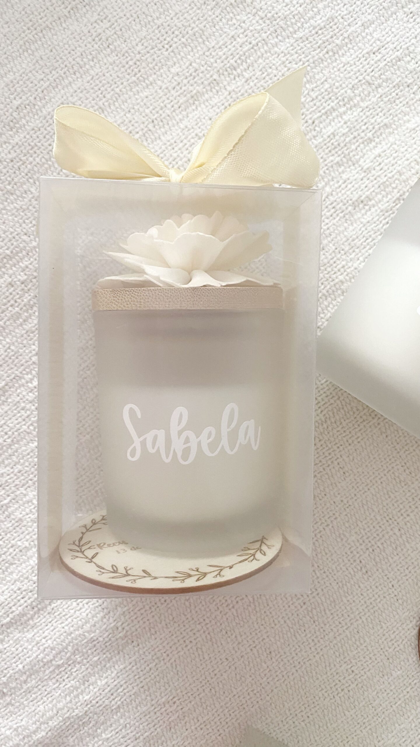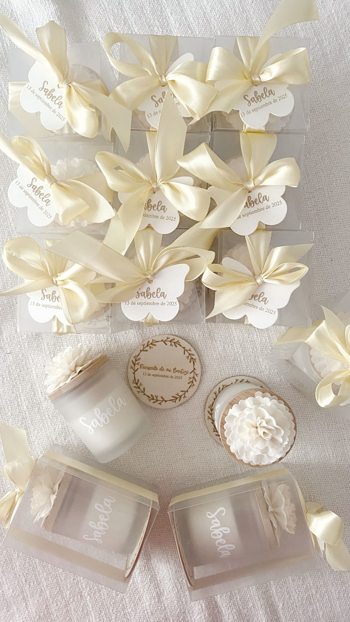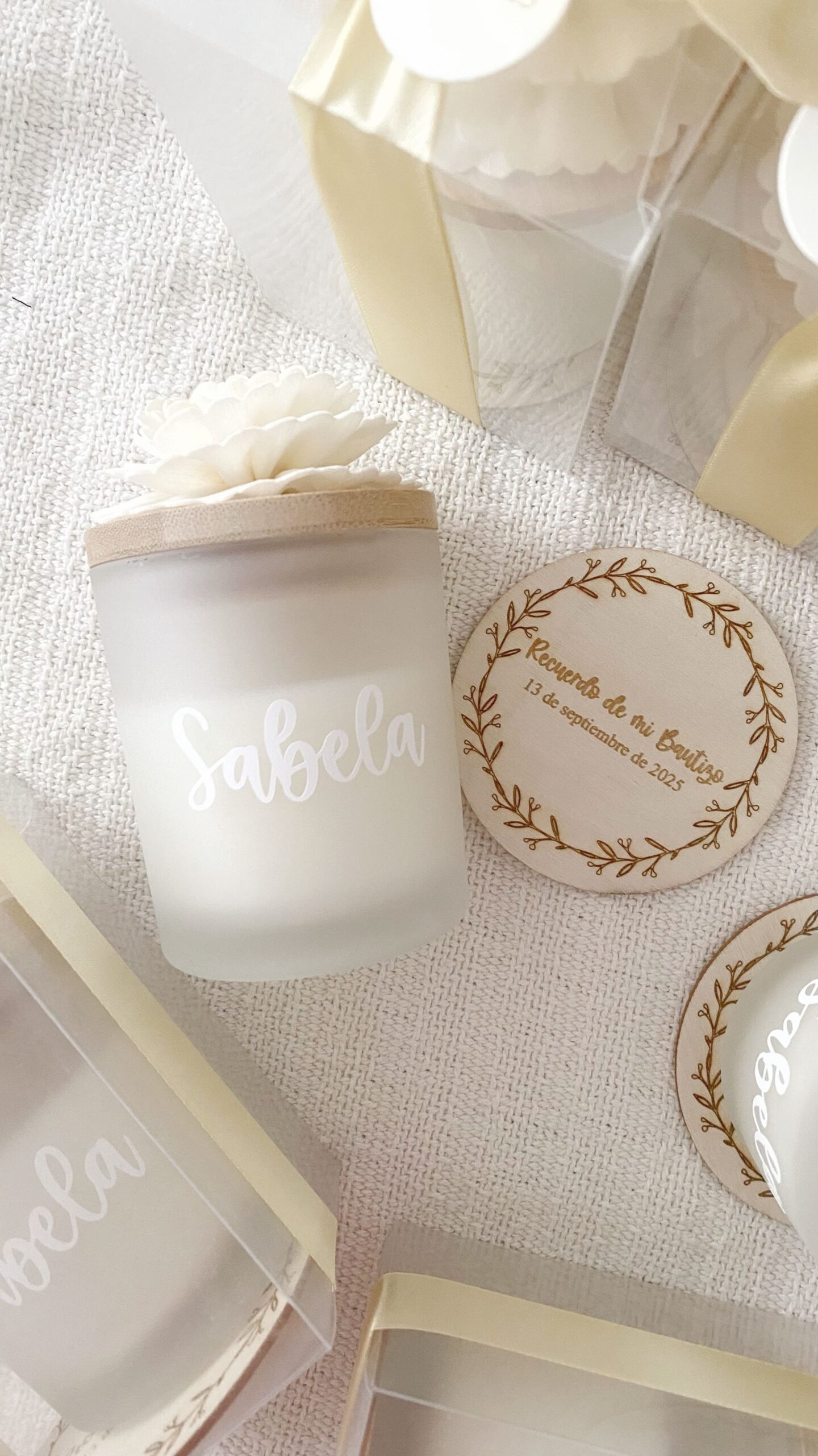 - Personalizada con el nombre o iniciales de tus invitados para que cada vela sea única y especial, en vinilo permanente blanco.